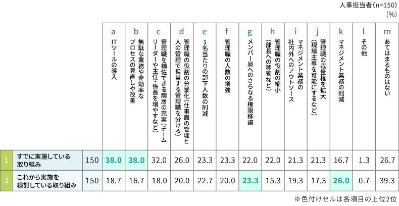 ・管理職の負荷軽減のための取り組みとしては、約4割の企業で「ITツールの導入(38.0%)」や「無駄な業務や非効率なプロセスの見直しや改善(38.0%)」がすでに実施されており、「マネジメント業務の削減(26.0%)」がこれから実施を検討している取り組みで最も選ばれた。