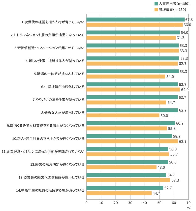 ・同じ設問に対する管理職層の回答は、1位「1.次世代の経営を担う人材が育っていない」、2位「6.中堅社員が小粒化している」、3位「3.新価値創造・イノベーションが起こせていない」だった。