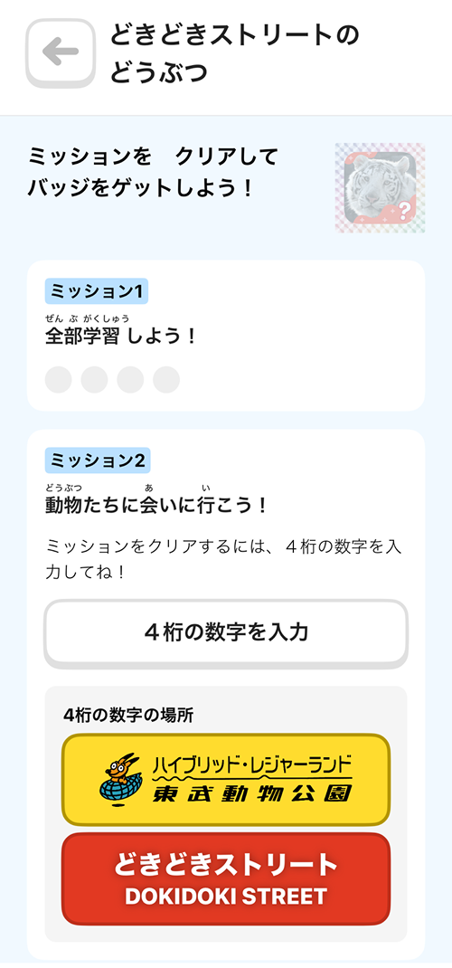 3. 動物たちについて学んだあと、東武動物公園を訪ね、園内の各所に設置されているパネルの4桁の数字をスマートフォンのMonoxer Juniorアプリ内に入力してください。