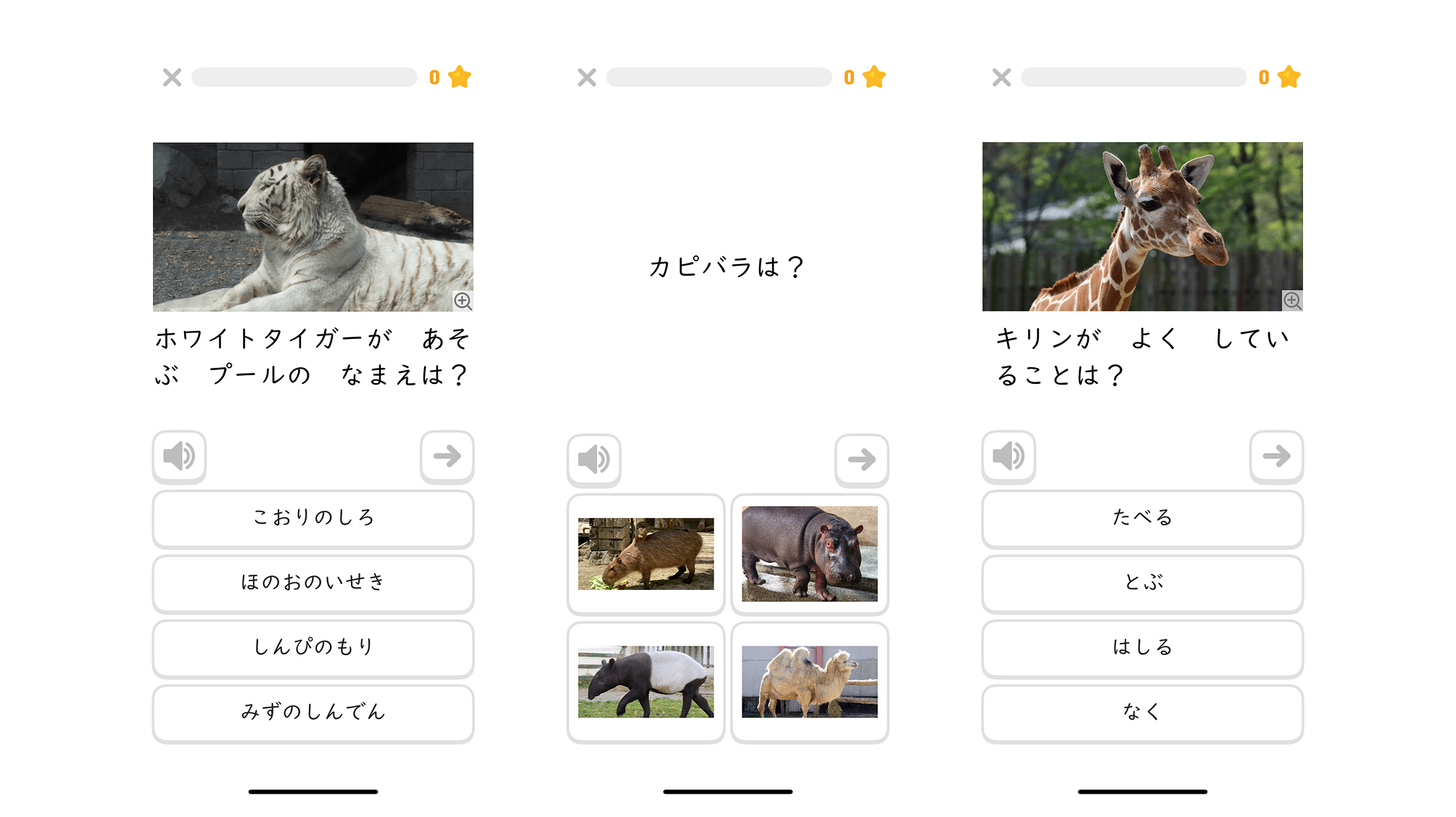 1. 来園前にスマートフォンにダウンロードしたMonoxer Juniorアプリ内の「とうぶどうぶつこうえん」の動物たちの生態や特徴についてクイズ形式で楽しみながら学んでください。