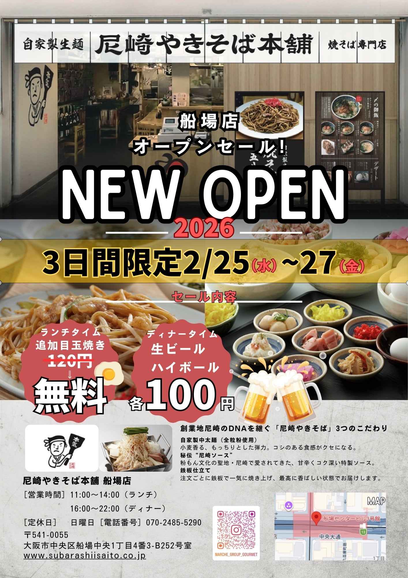 「人・おいしさ・楽しさ」をモットーに地元密着型の居酒屋チェーンを展開するマルシェ株式会社(本社:大阪市阿倍野区、代表取締役社長:加藤 洋嗣)は、2026年2月25日(水)新店舗「尼崎やきそば本舗」船場店を船場センタービル3号館にオープンいたしました。