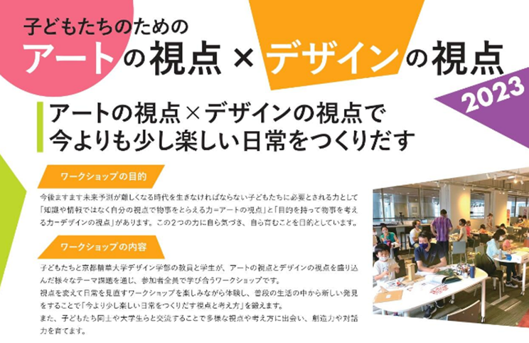 子どもたちと京都精華大学デザイン学部の教員と学生が、アートの視点とデザインの視点を盛り込んだ様々なテーマ課題を通じ、参加者全員で学び合うワークショップです。