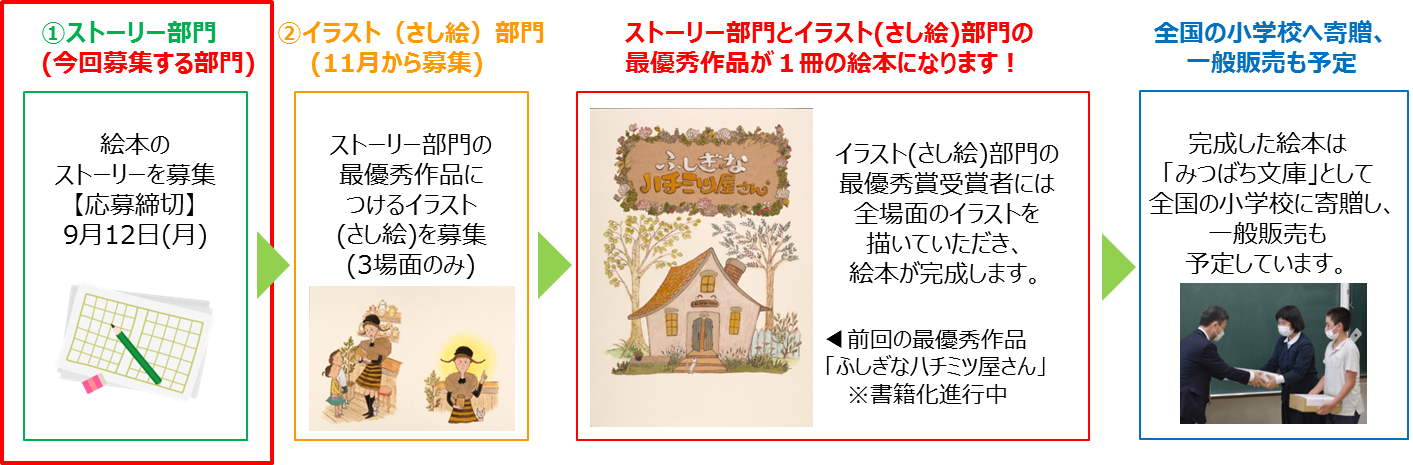 当コンクールではまず、絵本のストーリー作品を募集します。その後、ストーリー部門の最優秀賞に選ばれた作品の内容にあわせたイラスト(さし絵)を募集する、2段階形式で行います。当コンクールのストーリー部門およびイラスト(さし絵)部門の最優秀作品は書籍化し、「みつばち文庫」の1冊として全国の小学校に寄贈しています。