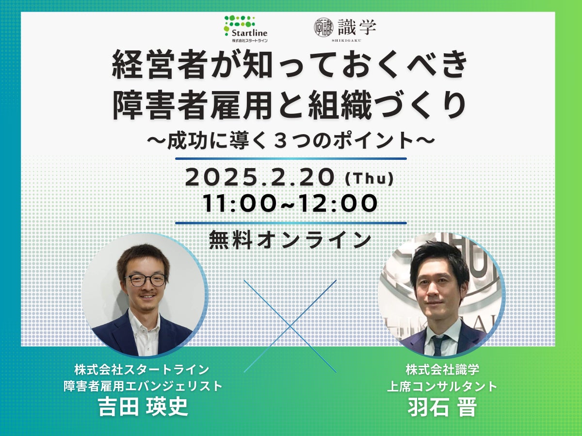 障害者就業支援を通じて“誰もが自分らしく生きる社会”を目指す株式会社スタートライン(本社:東京都三鷹市、代表取締役:西村賢治)は、「識学」を使った経営・組織コンサルティングや従業員向け研修を展開する株式会社識学(本社:東京都品川区、代表取締役社長:安藤広大、以下識学)と、『経営者が知っておくべき障害者雇用と組織づくり~成功に導く3つのポイント』のウェブセミナーを共催します。