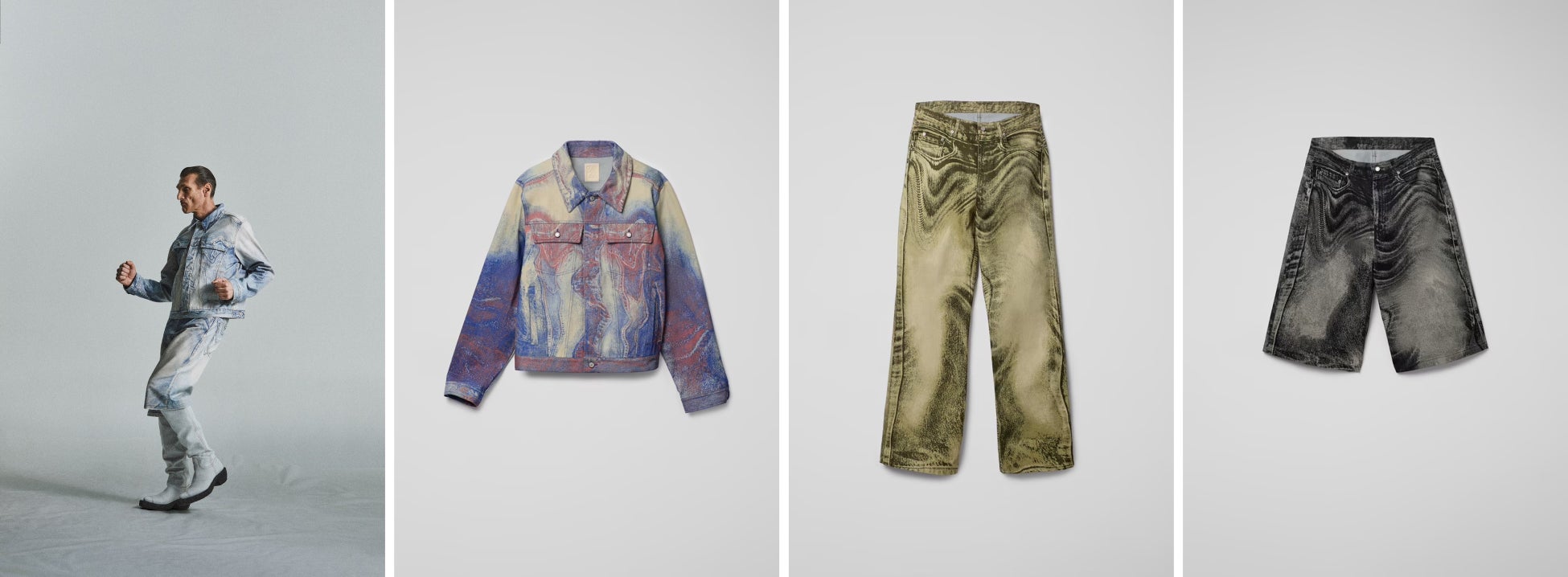 CAMPERLABオリジナルのデニムコレクションは、高品質なイタリアンデニム生地「CANDIANI(カンディアーニ)」※で作られ、目の錯覚を利用した「トロンプルイユ(騙し絵)」プリントが施されています。実際にはないヒゲ、アタリ、擦れ、陰影などあたかも実在するかのように見せて、カンペールラボの美学を表現しています。素材はオーガニックコットン製で、柔らかな着心地を得られます。アイテムはジャケット、ワイドショーツ、ジーンズの3型を4色で展開しています。デニムジャケットは、オーバーサイズでざっくりと着られるシルエットに仕上げています。