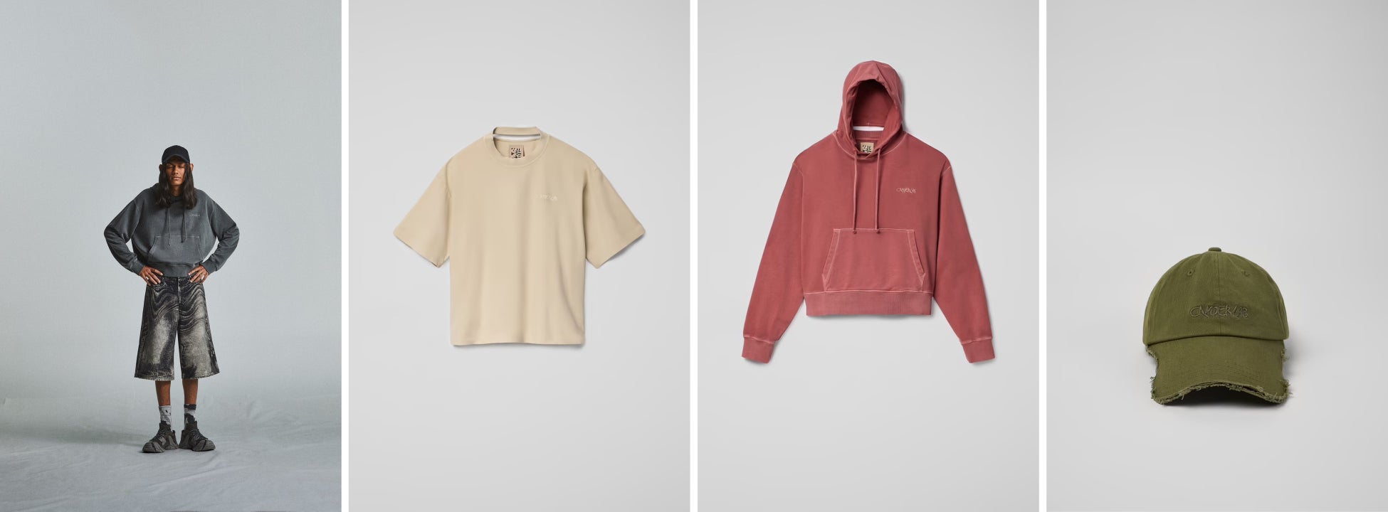 ほど良い厚みとゆったりしたシルエットのフーディー、ミニマルシルエットに首リブのスリットがアクセントのTシャツ、アシンメトリーにカットオフされたヴィンテージ感のあるキャップをラインナップ。いずれも同色の糸で「CAMPERLAB」のロゴが刺繍されています。ナチュラルとニュートラルを特徴とし、オフホワイト、レンガレッド、ミリタリーグリーン、ダークグレーなどのシーズナルカラーで展開します。