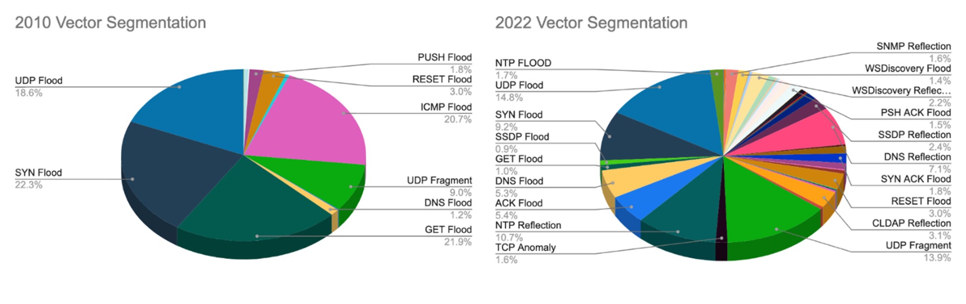 セキュリティチームもまた、一層巧妙化する多彩な手口の攻撃を阻止しなければならず、多大なプレッシャーにさらされています。2010 年には、DDoS 攻撃ベクトルのトップ 5 が全攻撃の 90% を占めていましたが、現在のトップ 5 が占める割合は 55% に過ぎず、攻撃の多様化が明らかです。