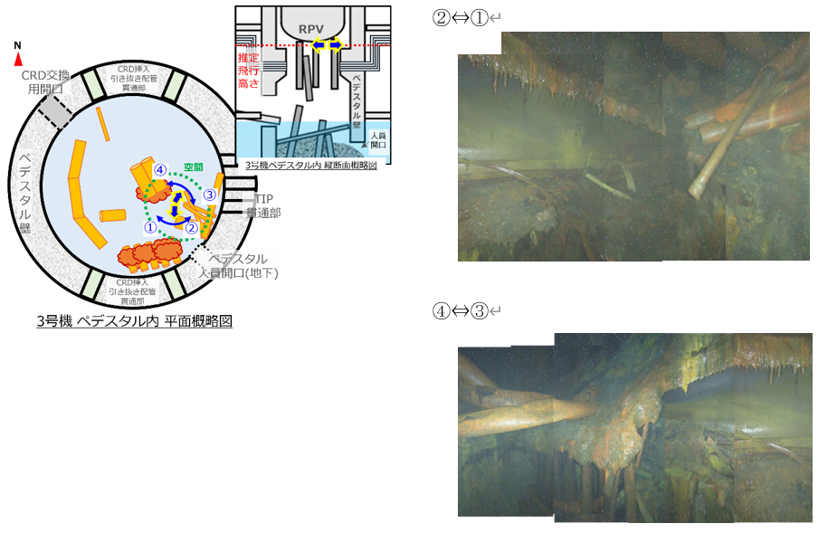 本調査において、当社のドローンは、PCV内部のペデスタル内部および燃料デブリの取り出しのアクセスルートとなり得る貫通孔の状態などを確認することを目的として投入され、3号機において原子炉圧力容器(RPV)底部付近の映像を取得し、RPV底部の可能性のある構造物を初めて確認しました。