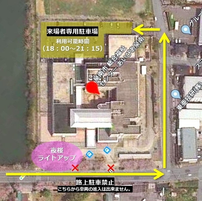 夜桜ライトアップ開催期間中は、総合福祉センターあいぴあ泉南の駐車場を来場者向けに無料開放いたします。