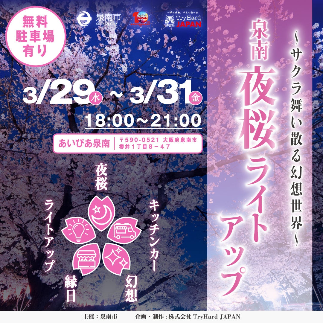 泉南市と株式会社トライハードジャパン(所在地:大阪市中央区)は、2023年3月29日(水)~3月31日(金)の3日間、総合福祉センターあいぴあ泉南(所在地:大阪府泉南市)にて、ライトアップイベント「泉南夜桜ライトアップ」を実施いたします。
