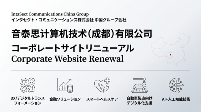 DXや訪日誘客支援、キャッシュレス決済などの分野で事業を展開するインタセクト・コミュニケーションズ株式会社(本社:東京都千代田区、代表取締役社長:譚 玉峰、以下当社)のグループ会社である 音泰思计算机技术(成都)有限公司(IntaSect Communications (Chengdu) Inc.) は、このたびコーポレートサイトを全面リニューアルしました。