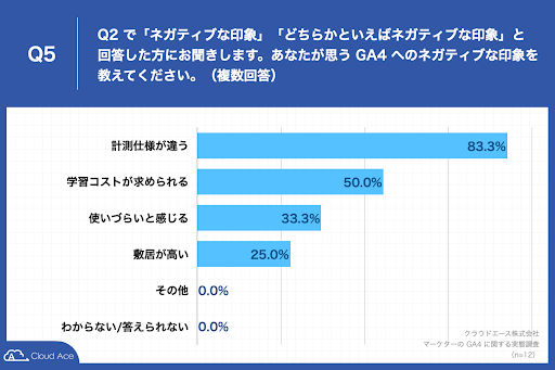 Q2 で「ネガティブな印象」「どちらかといえばネガティブな印象」と回答した方に、「あなたが思う GA4 へのネガティブな印象を、自由に教えてください。」と質問したところ、「計測仕様が違う」が 83.3%、「学習コストが求められる」が 50.0%、「使いづらいと感じる」が 33.3% という回答となりました。