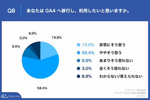 「あなたは GA4 へ移行し、利用したいと思いますか。」と質問したところ、「非常にそう思う」が 19.8%、「ややそう思う」が 58.4% という回答となりました。