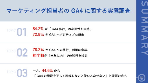 84.2% が「GA4 への移行」の必要性を実感移行スケジュール、半数以上が「半年以内」を検討