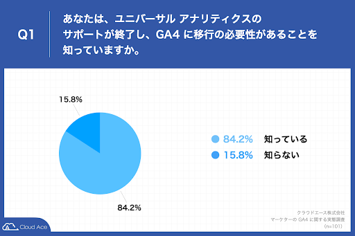 ■84.2% が、GA4 の移行の必要性を認識「あなたは、ユニバーサル アナリティクスのサポートが終了し、 GA4 に移行の必要性があることを知っていますか。」と質問したところ、「知っている」が 84.2%、「知らない」が 15.8% という回答となりました。