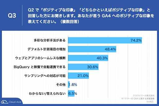 Q2 で「ポジティブな印象」「どちらかといえばポジティブな印象」と回答した方に、「 あなたが思う GA4 へのポジティブな印象を教えてください。」と質問したところ、「多彩な分析手法がある」が 74.2%、「デフォルト計測項目の増加」が 48.4%、「ウェブとアプリのシームレスな横断」が 40.3% という回答となりました。