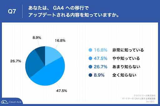「あなたは、GA4 への移行でアップデートされる内容を知っていますか。」と質問したところ、「非常に知っている」が 16.8%、「やや知っている」が 47.5% という回答となりました。