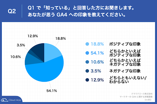 Q1 で「知っている」と回答した方に、「あなたが思う GA4 への印象を教えてください。」と質問したところ、「ポジティブな印象」が 18.8%、「どちらかといえばポジティブな印象」が 54.1% という回答となりました。