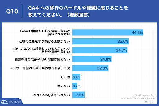 一方で、「GA4 の機能を正しく理解しないと使いこなせない」や「仕様の変更を学び続ける工数がない」といった声もあり、GA4 への移行についてハードルや課題があることも明らかになりました。