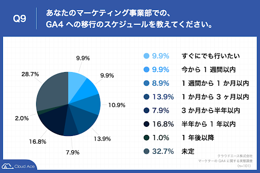 「あなたのマーケティング事業部での、GA4 への移行のスケジュールを教えてください。」と質問したところ、「すぐにでも行いたい」が 9.9%、「今から1週間以内」が 9.9% という回答となりました。