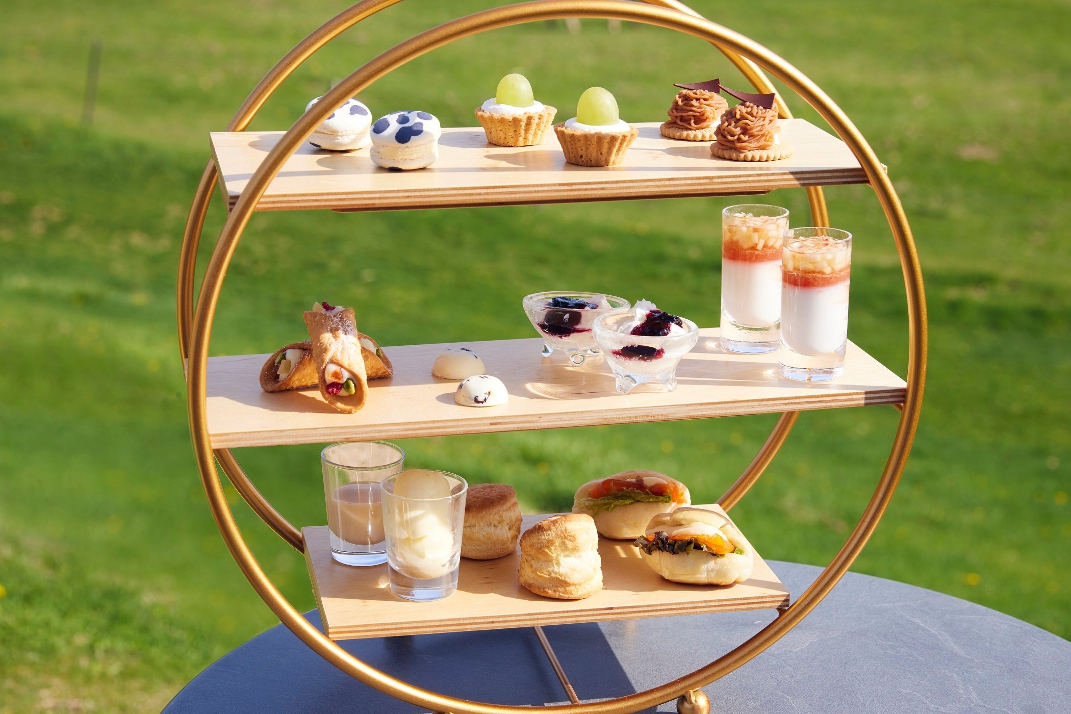2019年から始まった農業プロジェクト「ファーム星野」。今では、トマム牛乳(*2)の製造のみならず、チーズや生クリームなどの乳製品の加工に取り組んでいます。加工品は、リゾート内のレストランで提供したり、ホテルショップで販売したりと、多くの方に楽しまれています。2022年秋には、食べるバターを開発。蟹や鮭、ハスカップといった北海道ならではの食材や、かぼちゃや栗などの秋ならではの食材を用い、全10種類のフレーバーを提供しました。食べるバターは、動物がのんびりと過ごすファームエリアで北海道のワインとともに味わうことができ、大変好評でした。今年も大自然の恵みを味わってほしいとの思いから、トマムで作る乳製品を使ったアフタヌーンティーを考案しました。
