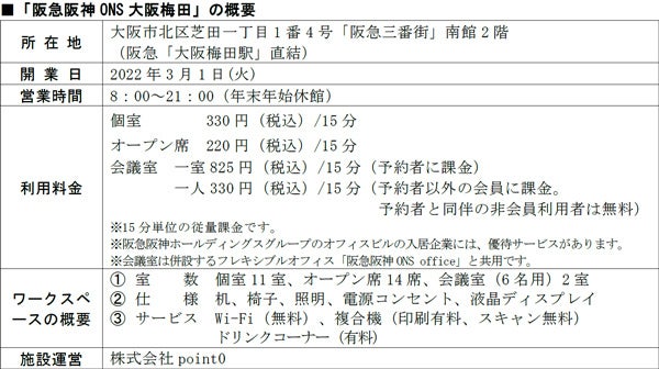 なお、『阪急阪神ONS大阪梅田』においては、大阪梅田という立地の利便性を活かして、移動中のスキマ時間を使った短時間作業等でのご利用を想定したオープン席も新設しました。個室よりも安価な料金設定としていますので、気軽にご利用いただけます。
