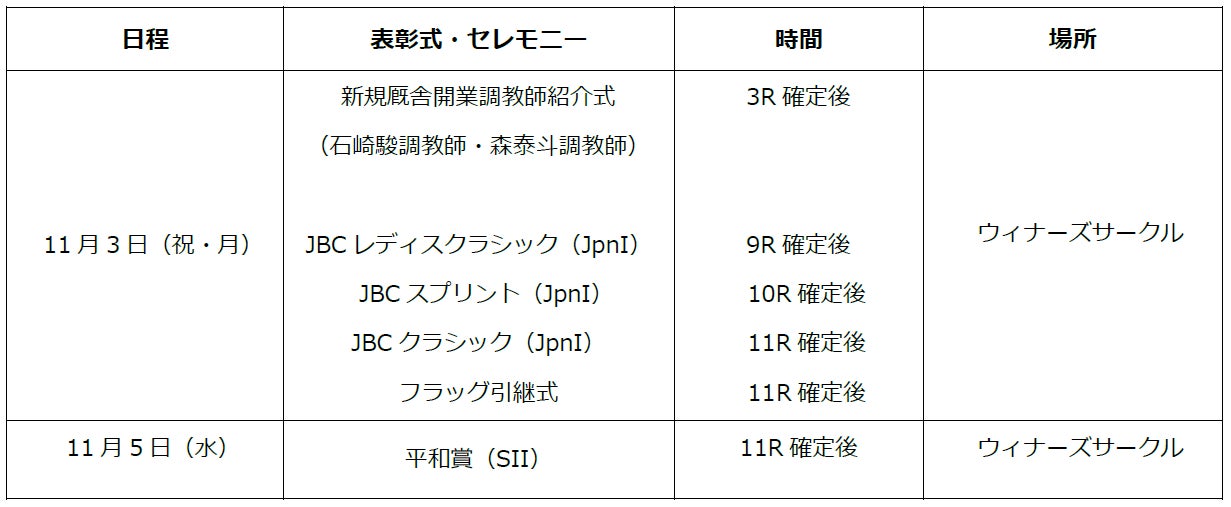 「JBCクラシック(JpnI)」「JBCスプリント(JpnI)」「JBCレディスクラシック(JpnI)」と国内最高峰の3競走が集結。迫力ある頂上決戦をぜひご堪能ください。また、11月5日(水)には未来のダート界を担う2歳馬たちが大舞台に挑む伝統の重賞「農林水産大臣賞典 平和賞(SII)」を実施いたします。若駒たちの力強い走りにもご期待ください。