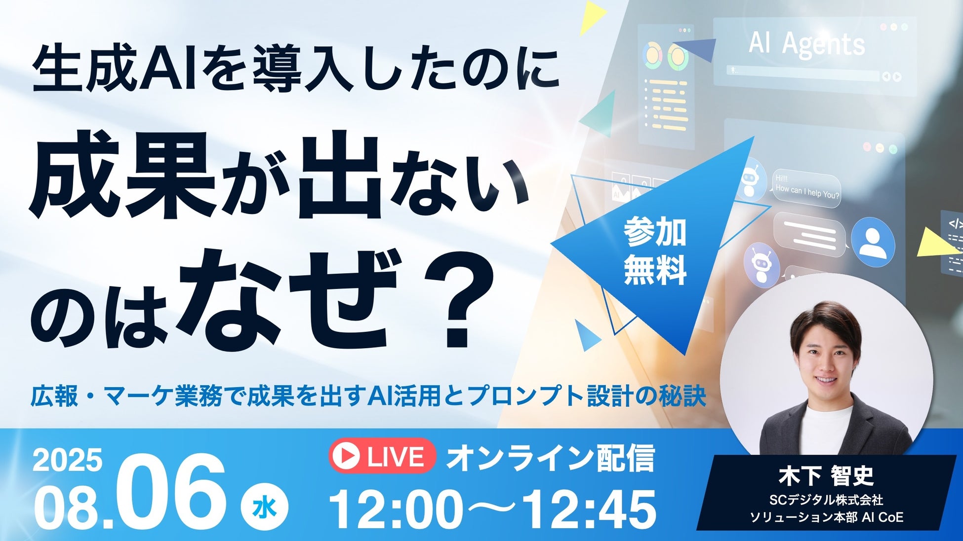 SCデジタル株式会社(代表取締役 社長執行役員CEO:中橋大樹、以下「SCデジタル」)は、2025年8月6日(水)に、広報・マーケティング業務における生成AIの活用と、成果につなげるためのプロンプト設計・実践法をテーマにした無料オンラインセミナーを開催します。