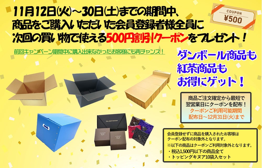 株式会社タチバナ産業(埼玉県春日部市、代表取締役:野原将彦)は自社サイト「だんぼーる本舗」で、11月12日(火)~11月30日(土)の期間中、500円割引クーポンのプレゼントキャンペーンを開始します。