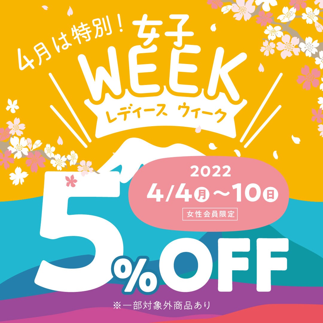 好日山荘では登山・アウトドアライフを楽しむ女性の皆さまをサポートすべく、4月4日(月)~4月10日(日)までお買い物が5%オフとなる「レディースウィーク」を開催します。通常、毎週木曜日に「レディースデー」として同内容で開催しご好評頂いておりますが、4月10日の「女性の日」にちなみ、スペシャルウィークとして7日間開催します。