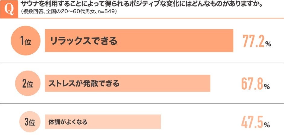 サウナを利用することによって得られる変化について聞くと、全体の9割以上となる91.5%もの人が「ポジティブな変化を感じている」と回答。具体的な変化としては、1位から「リラックスできる(77.2%)」、「ストレスが発散できる(67.8%)」、「体調が良くなる(47.5%)」が並ぶなど、心身両面のケアになっていると感じている人が多いことがわかります。