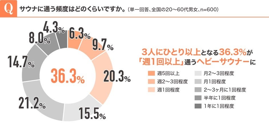また、サウナに通う頻度では、全体の3人にひとり以上となる36.3%が「週1回以上」通う“ヘビーサウナー”であることがわかりました。コロナ禍において、一過性のブームとして消費されるのではなく、一つのライフスタイルとして定着しているように伺えます。