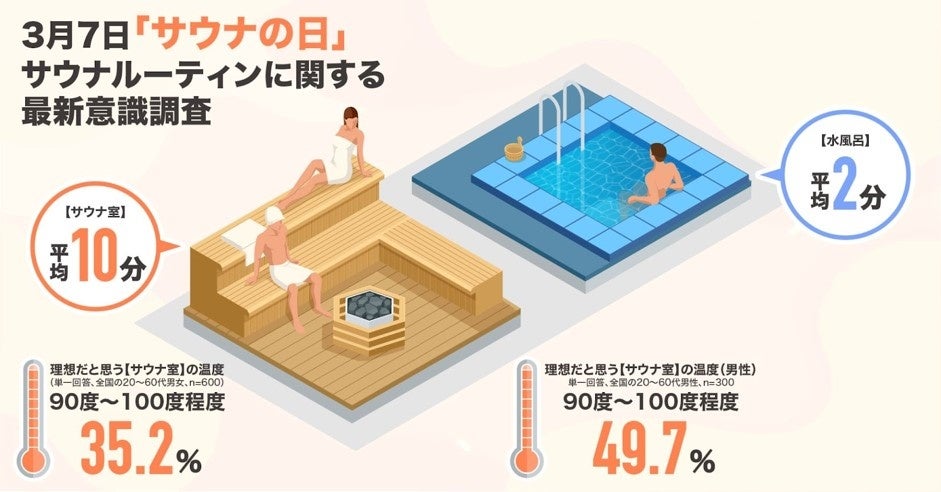 - サウナの1回あたりの入室時間は平均「10.01分」。理想の温度はサウナ室「90度~100度程度」、水風呂「17度~20度程度」がそれぞれ1位に。
