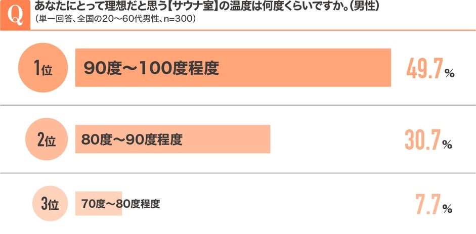 また、サウナ室の理想の温度について聞くと、1位から「90度~100度程度(35.2%)」、「80度~90度程度(31.5%)」、「70度~80度程度(11.7%)」という結果に。性年代別では、男性は全年代で「90度~100度程度」が49.7%とおよそ半数となり、女性の20.7%に対して倍以上の数値と、高めの室温を理想とする傾向にあることが伺えます。