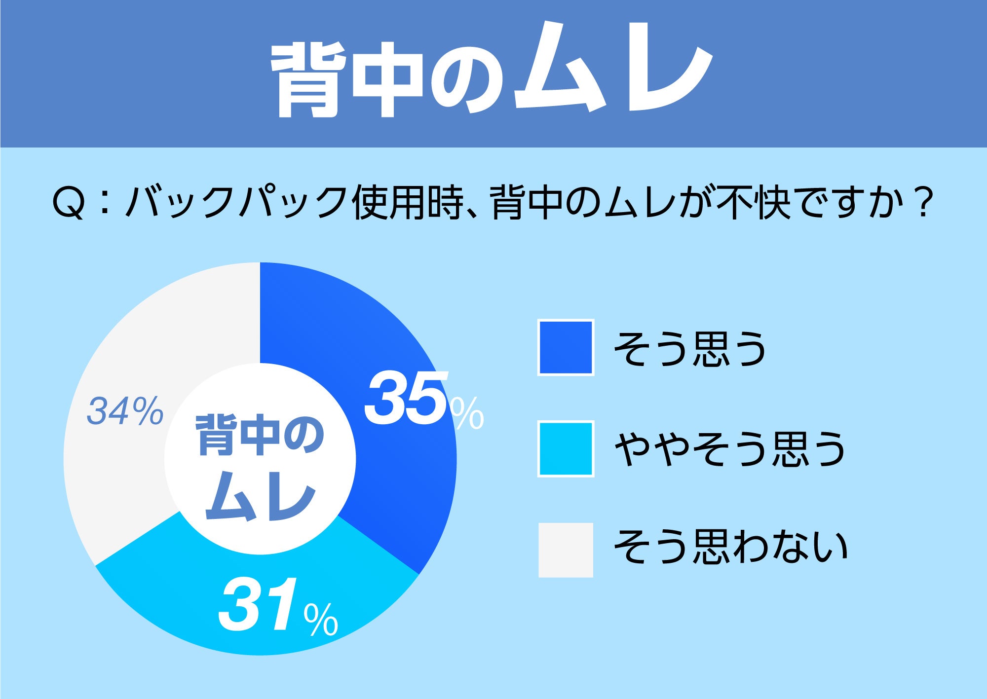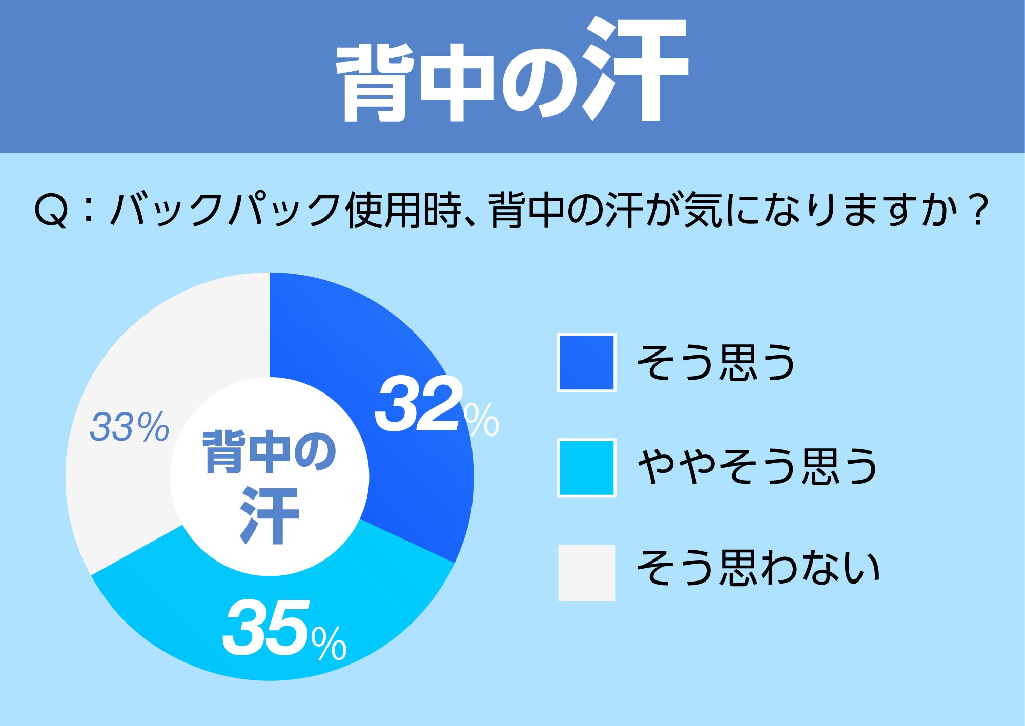 ● リュックタイプに対する“気になる・不快点“は、【背中に汗をかきやすい】【背中のムレ】で、回答者の約2/3が、「気になる~やや気になる」と回答。