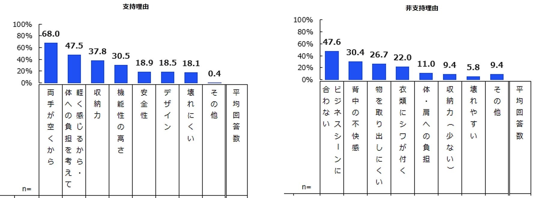● リュックタイプ支持の理由は「両手が空く」こと。一方、非使用理由は「ビジネスシーンに合わない」とする声が主。