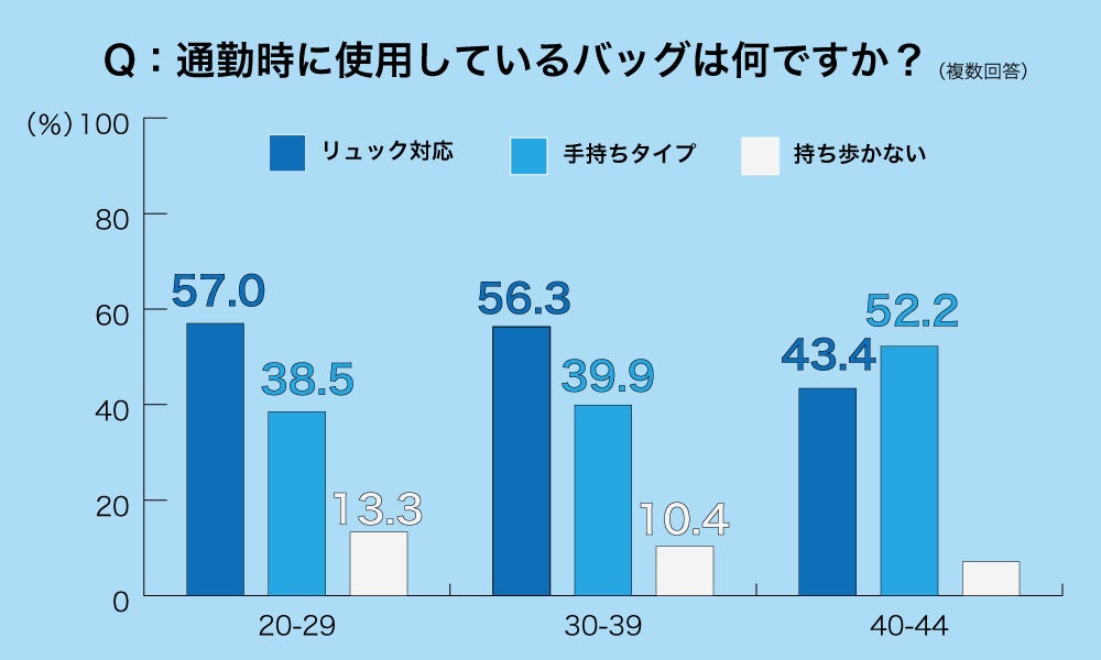 ● 20・30代では、6割弱がリュックタイプを使用しており、ビジネスバッグの主流な形となっている。