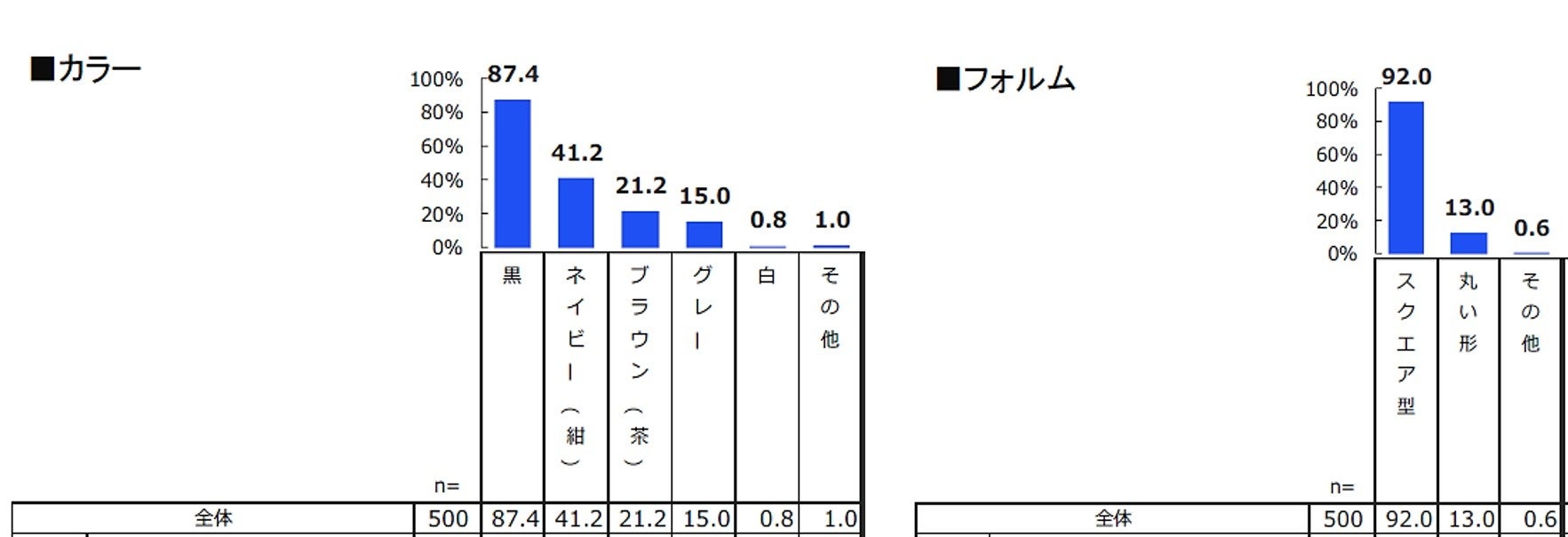 ● デザイン面では「ビジネスシーンに合う」ことが重視され、「黒色」「スクエア型」がよく選ばれている。
