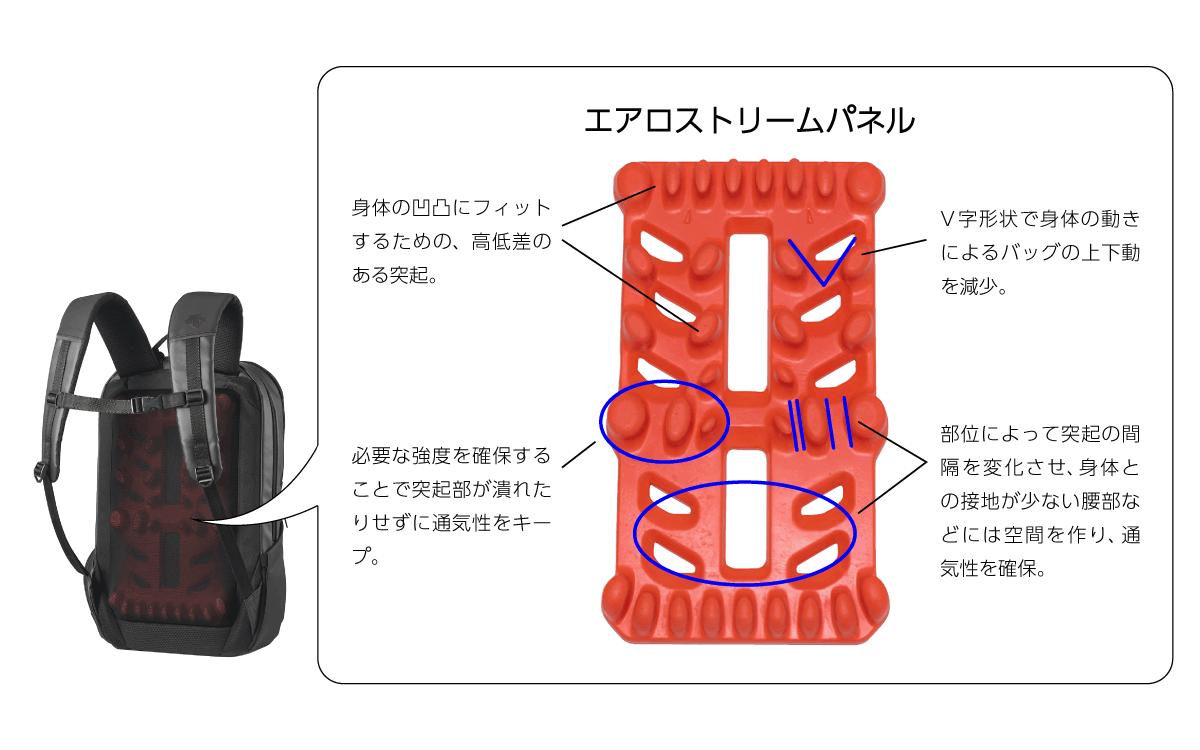 通気性の高い背面の立体成型パーツにより着用時の蒸れや温度上昇を軽減することが期待できる機能的なバックパック。ビジネスシーンにも合うシンプルでスマートなデザインにPCポケットやフロント、サイドに配した様々な機能ポケット、目立ちにくい黒色の再帰反射などの機能も備え持つ。表面素材の防水性に加え、レインカバーも付いているので悪天候にも対応。(参考:https://www.makuake.com/project/aero-stream/)