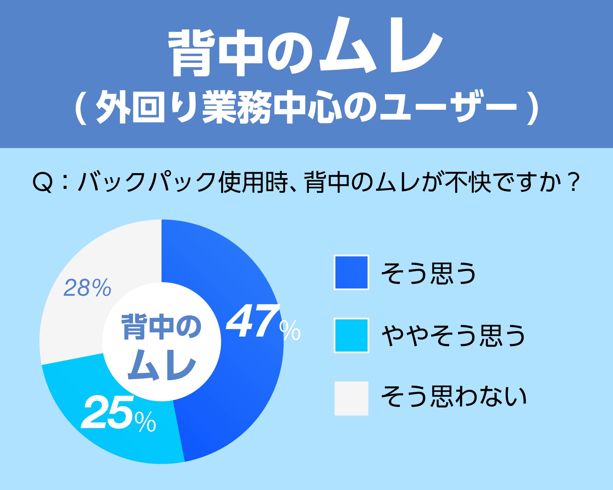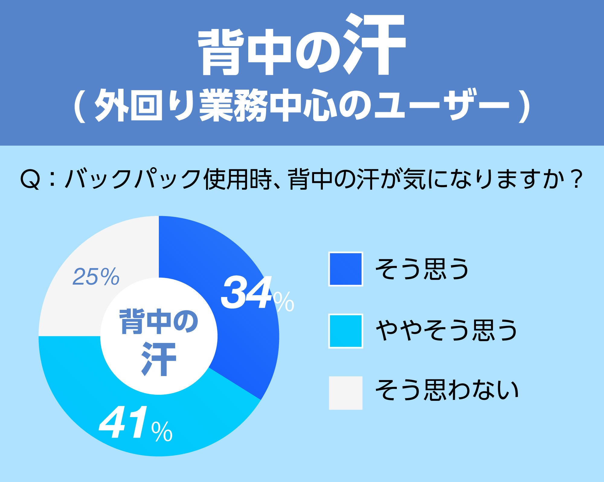 ● 外回り中心の勤務形態の人は、顧客視線を意識するためか、「ビジネスシーンに合わない」というイメージや、【背中の汗・ムレ】の他、【衣類にシワが付く】などを懸念。リュックタイプの使用にやや消極的。