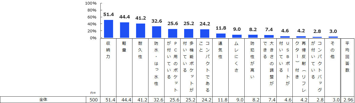 ● 機能面は、「収納力」「軽量」「耐久性」がトップ3、外回り中心は「耐久性」を最重視。以下、「防水・はっ水性」「PC・多機能ポケット付き」などの点が続く。