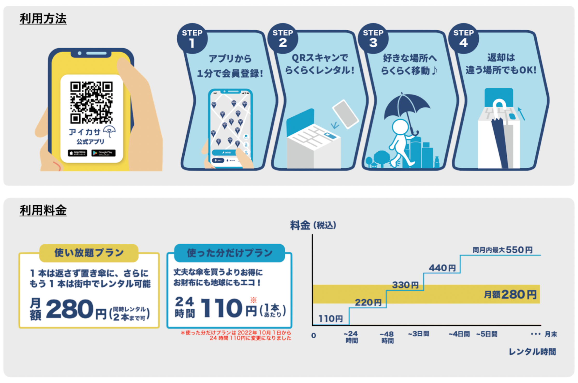 「アイカサ」は、“雨の日を快適にハッピーに”と“使い捨て傘をゼロに”をミッションに2018年12⽉にサービスを開始した日本初の本格的な傘のシェアリングサービスです。突発的な雨にもビニール傘をその都度購入せずに、駅や街中で丈夫でサステナブルなアイカサを借り、雨が止んだ際には最寄りの傘スポットに傘を返却することでエコに貢献しながら手ぶらで便利に移動ができるのが特徴です。(アイカサ1回の利用でCO2約692g削減*)