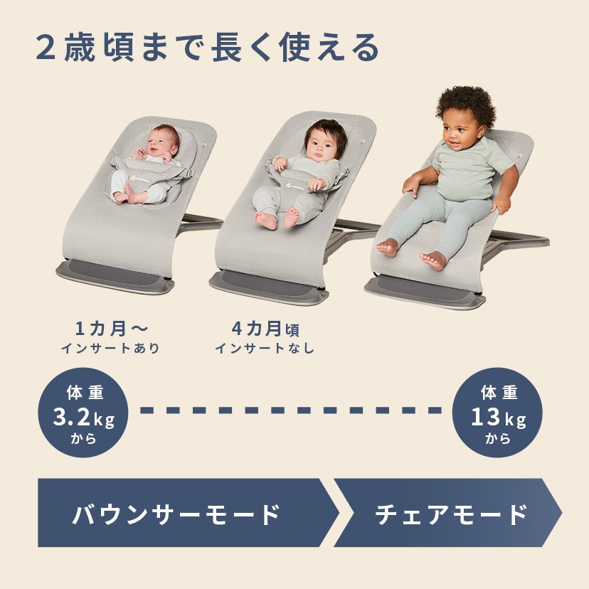 心地よい揺れで赤ちゃんをあやしてくれるバウンサーは子育ての強力サポーター。エルゴベビーのバウンサーはインサート付きで首すわり前から使用可能で、モードチェンジして長くご愛用いただけることが魅力です。日本初登場から1年半が経ち、多くのファミリーの暮らしにゆとりをお届けしてまいりました。
