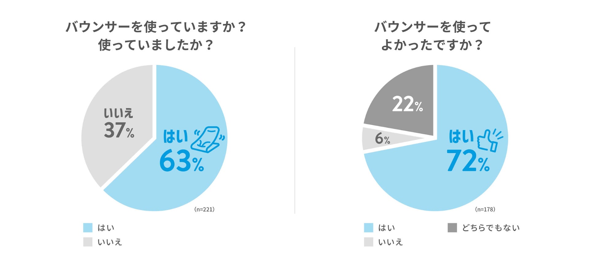Instagramでのアンケートによると、63%がバウンサーを使用、そのうち72%が「使ってよかった」と回答し、あると便利な育児用品として認知されています。