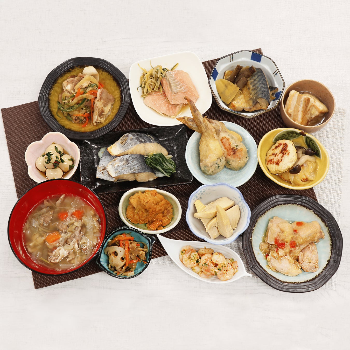 筍の醬油煮(約80g)/鮭の生姜蒸し(約140g)/きんぴら(約80g)/豆腐ハンバーグ(約150g)/豚汁(約200g)/手羽先餃子(2本)/油淋鶏(約140g)/豚の角煮(約130g)/海老の甘辛ネギまみれ(約80g)/さばの煮付け(約150g)/鶏肉のねぎ塩炒め(約140g)/さわらの幽庵焼き(約120g)/豚の生姜焼き(約160g)/ウズラの味付け卵(約80g)