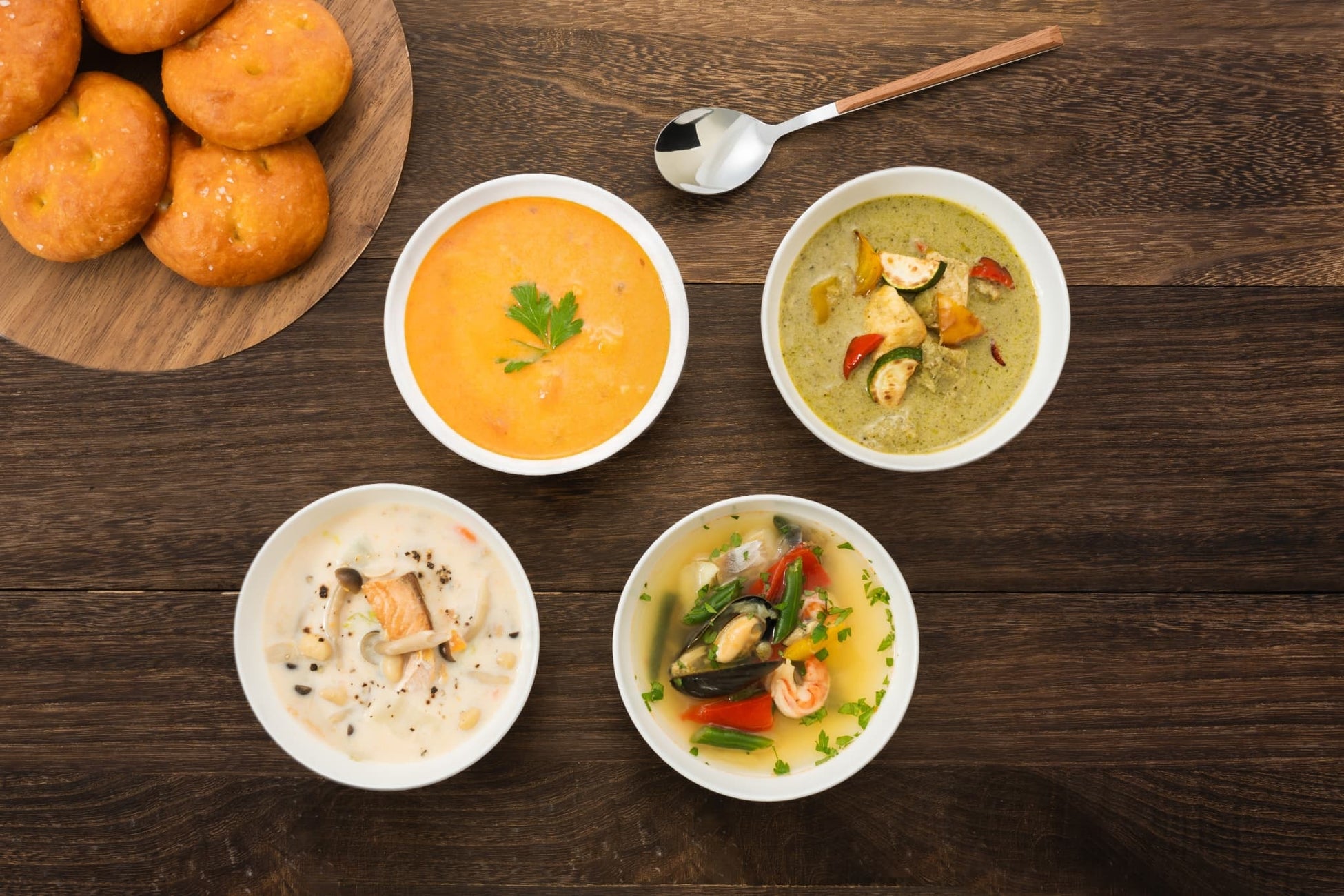 ・内容詳細:オマール海老のビスク(250g)2袋/グリーンカレー風スープ(250g)2袋/アクアパッツァ風スープ(250g)2袋/鮭ときのこの豆乳スープ(250g)2袋