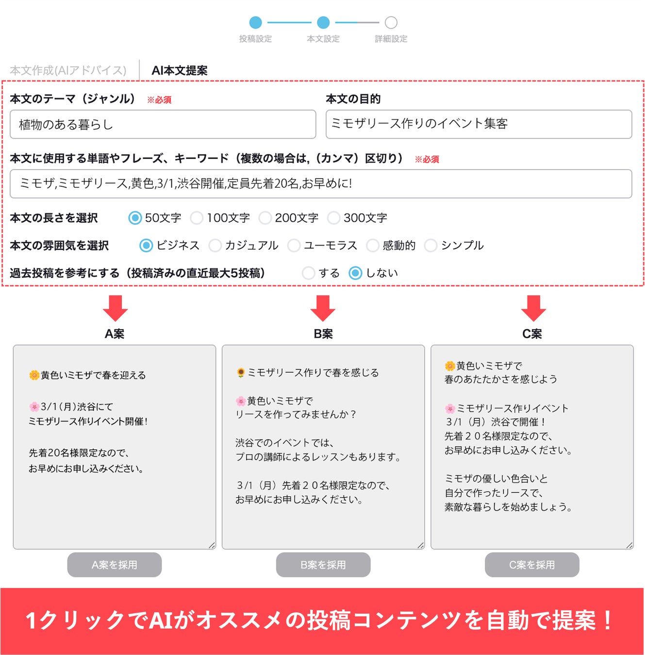 今回アップデートした投稿コンテンツ自動作成機能は、投稿ジャンル、目的、利用する関連単語の3項目を設定するだけで、3パターンの投稿を作成します。