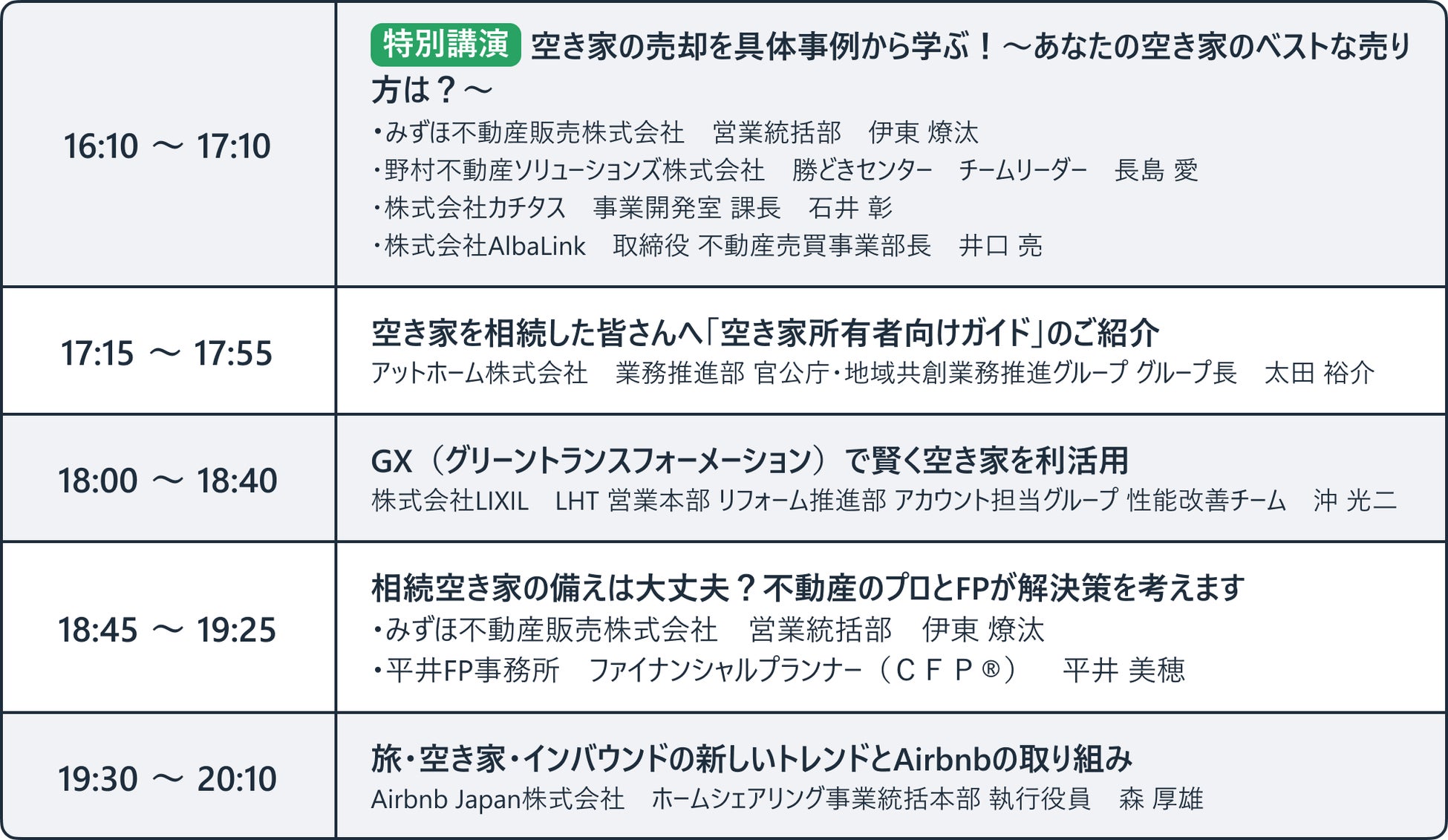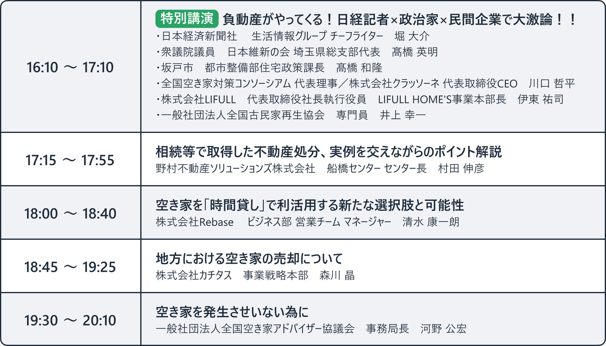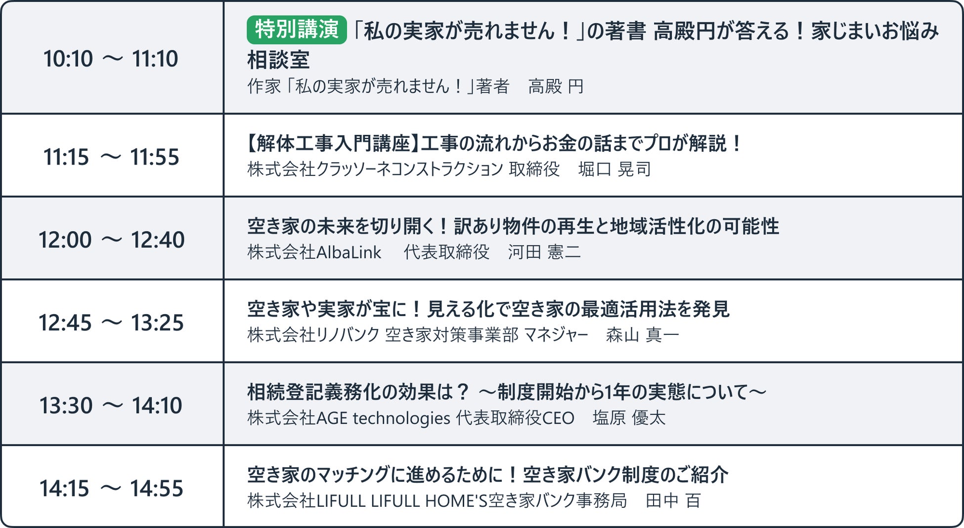 コンソーシアム参画団体による講演プログラムに加え、実際に家じまいを経験した「私の実家が売れません!」の著書、高殿円氏によるお悩み相談企画や、日本経済新聞 生活情報グループ チーフライター 堀大介 氏、衆議院議員 日本維新の会 埼玉県総支部代表 高橋英明 氏、本コンソーシアム賛同自治体である坂戸市より住宅政課長をゲストにお呼びし、空き家問題の課題について考える対談企画も実施いたします。