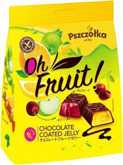 商品特徴:レモン・オレンジ・チェリー・青りんご果汁を使用した4種のゼリーをダークチョコでコーティング。