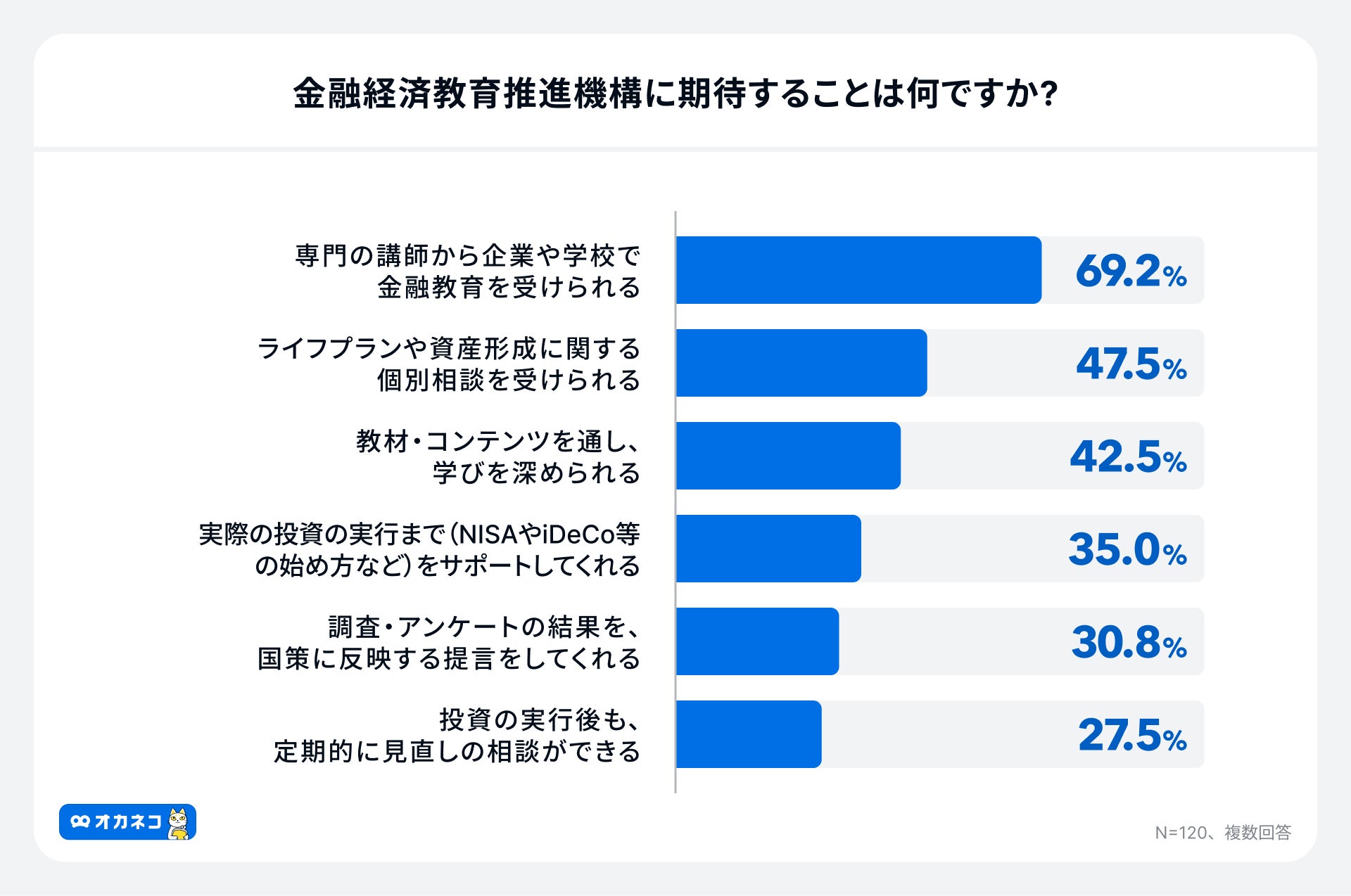 金融経済教育推進機構のスタートを知っている方に「期待することは何ですか」と質問したところ、専門の講師から企業や学校で金融教育を受けられる69.2%、ライフプランや資産形成に関する個別相談を受けられる47.5%の順に多い結果となりました。金融教育を基に専門家等への個別相談を行いながら、自分にあった資産形成を実践していきたい方が多い様子がみられます。